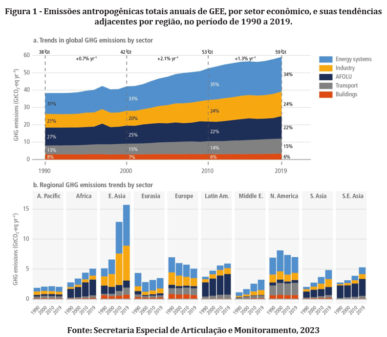 A Figura 1 ilustra as emissões antropogênicas totais anuais de GEE, por setor econômico, e suas tendências adjacentes por região, no período de 1990 a 2019, disponibilizadas pelo IPCC. O estudo aponta o setor energia, como o maior emissor (34% das emissões globais de GEE, em 2019, com 20 GtCO2-eq), seguido da indústria (24% - 14 GtCO2-eq); agricultura, silvicultura e outros usos da terra - AFOLU (22% - 13 GtCO2-eq); transportes (15% - 9,7 GtCO2-eq) e edifícios (5,6% - 3,3 GtCO2-eq). Para a produção de energia e calor, a queima de carvão, gás natural e petróleo é a maior fonte individual de emissões de GEE.
