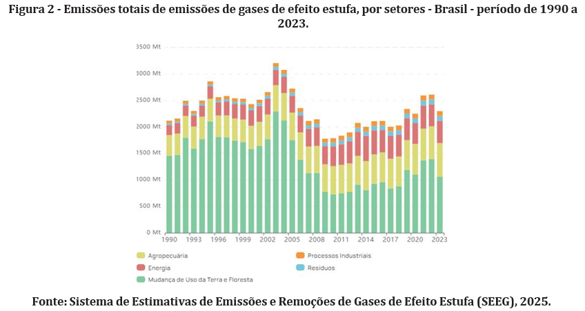A Figura 2 ilustra as emissões totais de emissões de gases de efeito estufa, por setores, no período de 1990 a 2023, disponibilizado pelo Sistema de Estimativas de Emissões e Remoções de Gases de Efeito Estufa (SEEG)4, desenvolvido pelo Observatório do Clima5. Os dados indicam que em 2023, o Brasil registrou cerca de 2,3 bilhões de toneladas de CO2 equivalente (GtCO2e), o que representa uma redução de 24% em relação a 2022, quando o país emitiu 2,6 bilhões de toneladas. A redução se deve pela queda nas emissões por desmatamento, decorrente das políticas de comando e controle da devastação na Amazônia.