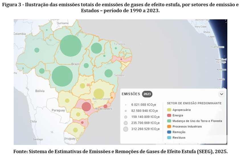 Diante dos aspectos apontados, as emissões de GEE no Brasil refletem as características econômicas, produtivas e territoriais de cada região. Enquanto que a Mudança de Uso da Terra e Floresta (LULUCF) predomina nas Regiões Norte, Nordeste e Centro-Oeste, em estreita relação com o desmatamento e a expansão do agronegócio, nas Regiões Sudeste e Sul destacam-se as emissões vinculadas à Energia e Processos Industriais, associadas à urbanização e industrialização mais intensas.