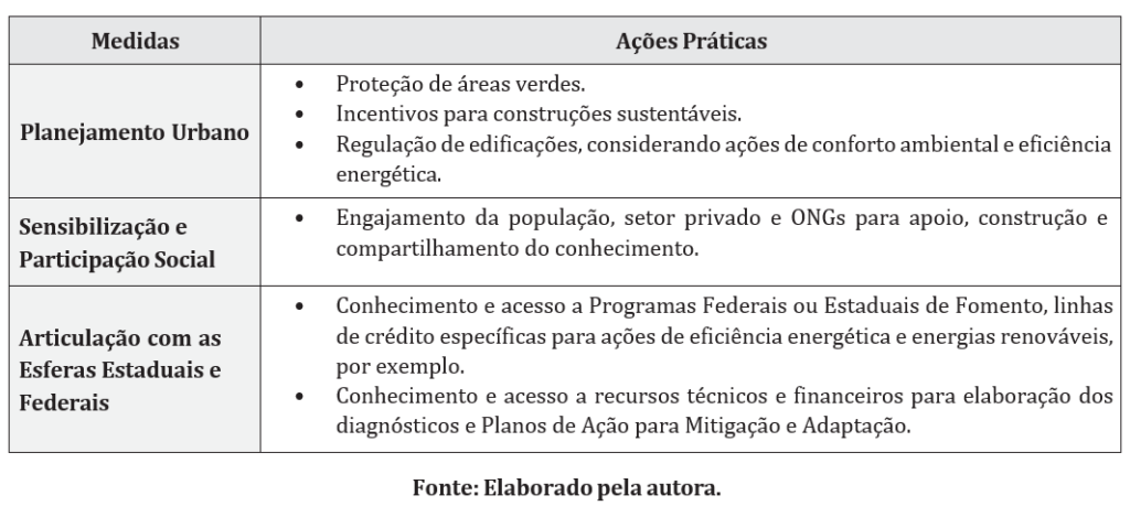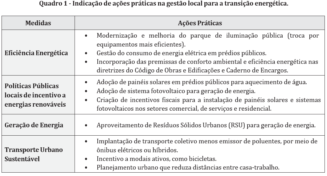 Na tentativa de reunir indicações para os Municípios, o Quadro 1 apresenta ações práticas na gestão local, com vistas à contribuição na transição energética no Brasil.