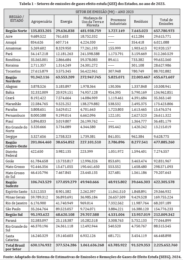 A Tabela 1, reúne os dados das emissões por setor, predominantes nos Estados e a totalização por Região.