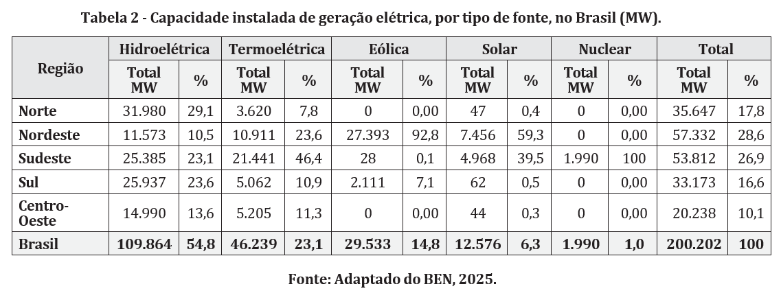 Segundo dados do Balanço Energético Nacional (BEN, 2025), agrupados na Tabela 2, o Brasil possui a capacidade instalada de geração de energia7 de 200.202 MW, sendo 54,88% de fonte hidroelétrica, 14,75% eólica e 6,28% solar, o que representa 75,91% de origem de fontes renováveis, do total disponível no Brasil. Somada às importações, as fontes renováveis representam 88,00% da oferta interna de eletricidade no Brasil.