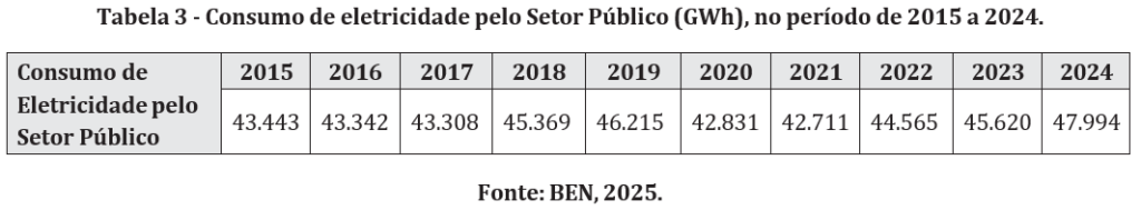 O Balanço Energético Nacional (BEN, 2025), elaborado pela Empresa de Pesquisa Energética (EPE) do Ministério de Minas e Energia, aponta que o consumo de energia elétrica pelo Setor Público se apresenta crescente8, conforme dados ilustrados na Tabela 3.