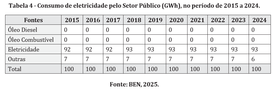 A Tabela 4 apresenta a evolução do consumo dos energéticos pelo Setor Público entre 2014 e 2024.
